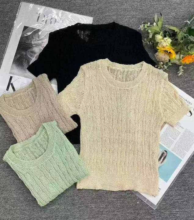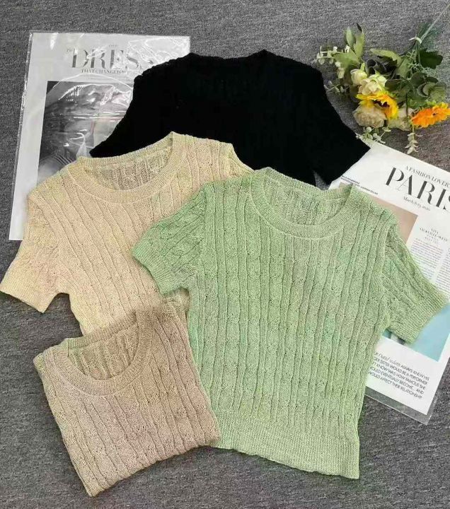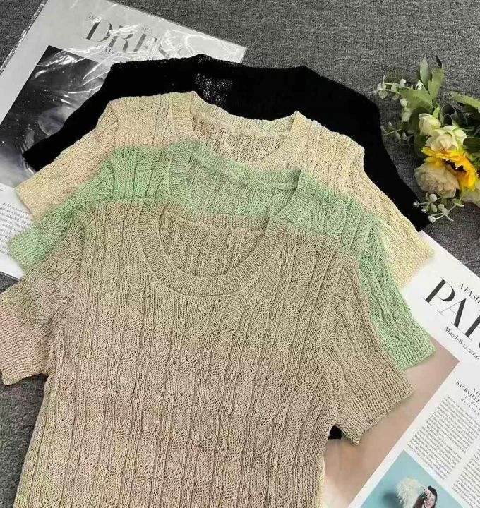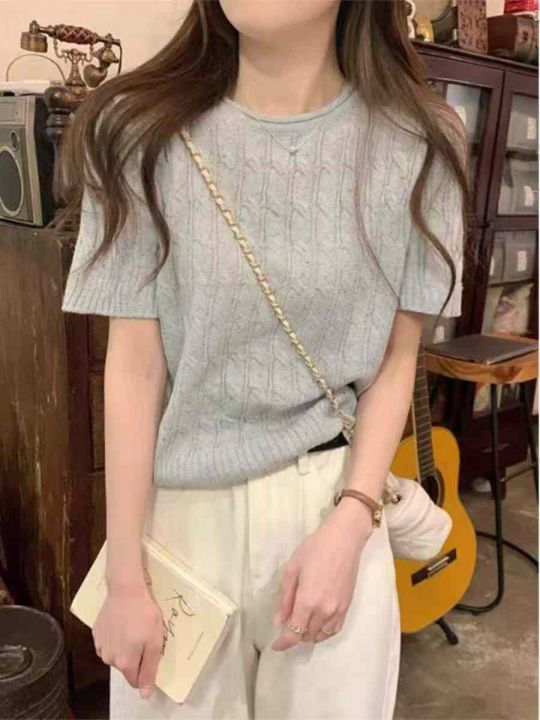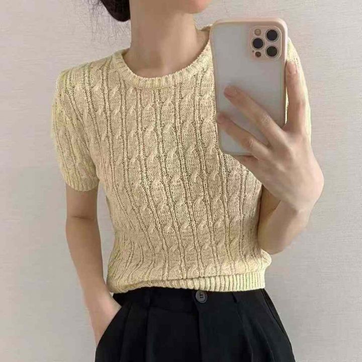 夏季新款韩版复古麻花冰丝圆领短袖针织T恤,独立包装...