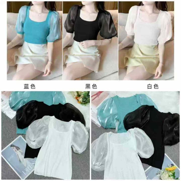 夏季新款时尚法式方领拼接泡泡袖弹力修身针织小衫,独立包装,均码面料柔软舒适弹力大,930件,腾仓库,全清5.9元亏本处理!分货加一!