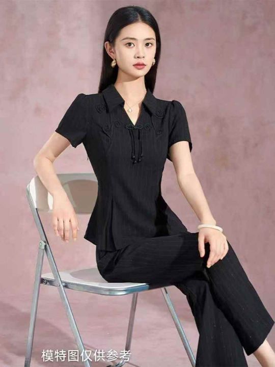 7.8清电商仓回收569套气质国风改良新中式条纹翻领短袖长裤套装,码数2-4-6...