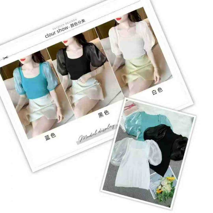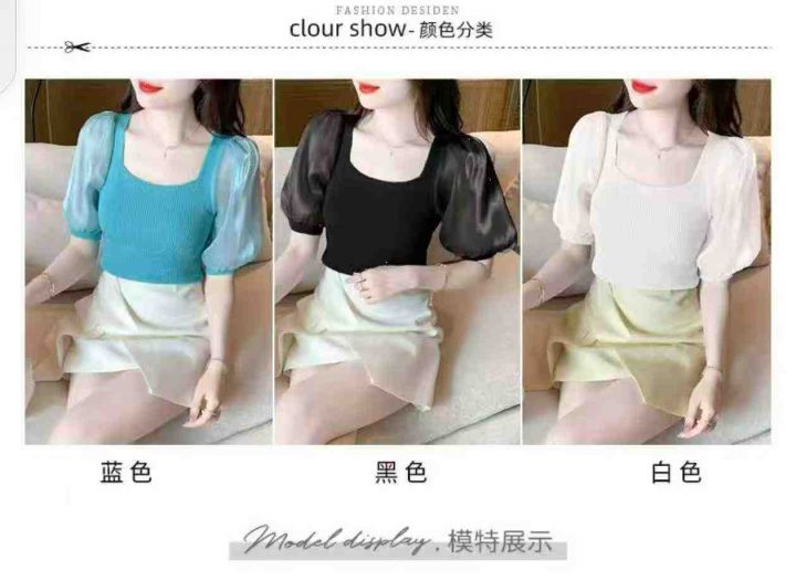 夏季新款时尚法式方领拼接泡泡袖弹力修身针织小衫,独立包装,均码面料柔软舒适弹力大,930件,腾仓库,全清5.9元亏本处理!分货加一!