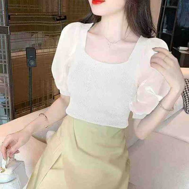 夏季新款时尚法式方领拼接泡泡袖弹力修身针织小衫,独...