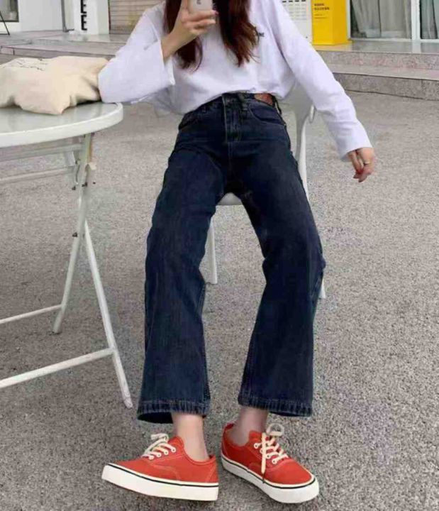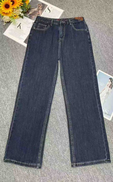 秋季新品大码女装复古高腰直筒阔腿宽松深色牛仔长裤,...