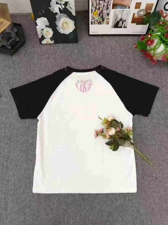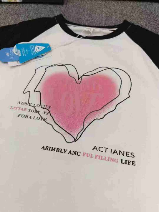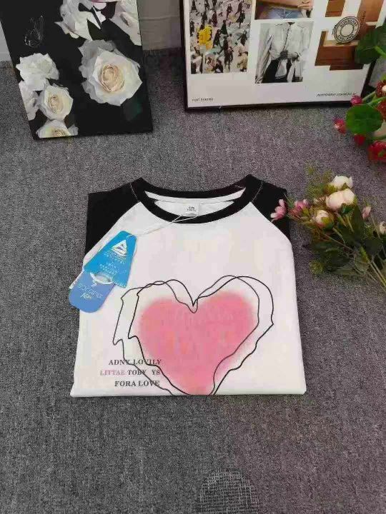 心型logo插肩童装短袖 数量1200件左右 尺码110--160 后领包边 独立包装带吊牌 大货干净整齐漂亮 模特图供参考