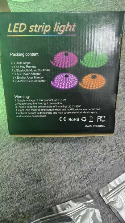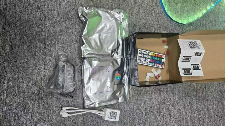 2盘RGB灯带,支持APP控制,亮度可调,定时功能,44键遥控器、AC电源适配器、说明书、4PIN RGB连接线都有