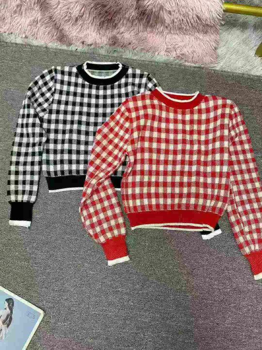 1100件左右小个子撞色格子长袖针织衫女圆领秋冬外穿韩版宽松套头打底衫上衣,独立包装,整款三色,均码,全清5.9元。