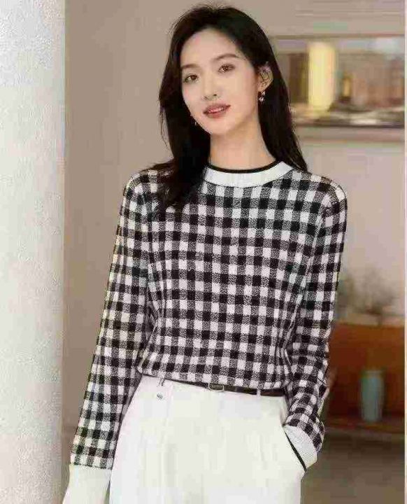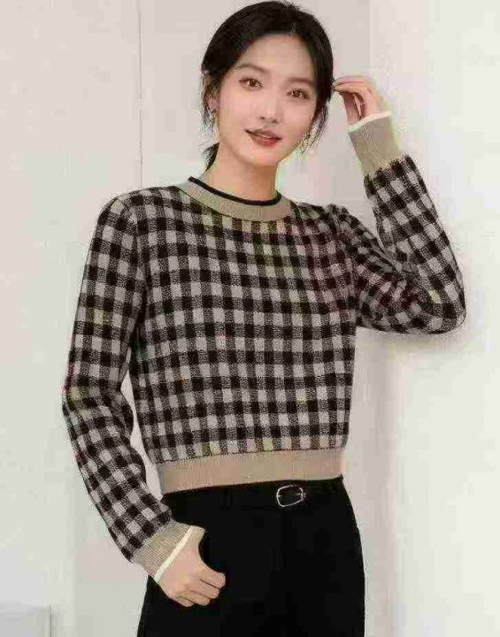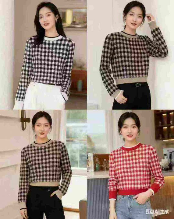 1100件左右小个子撞色格子长袖针织衫女圆领秋冬外穿韩...