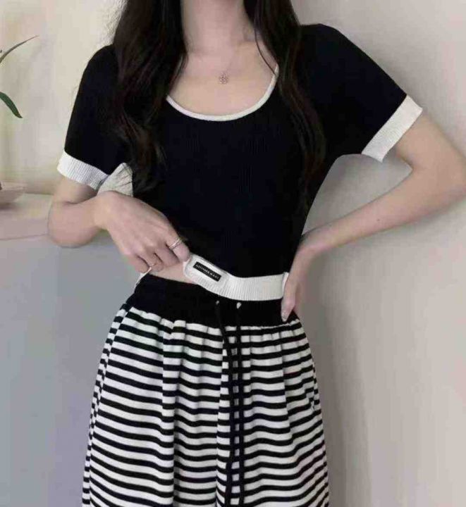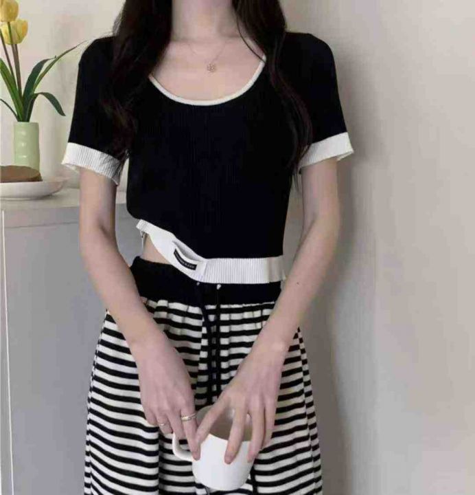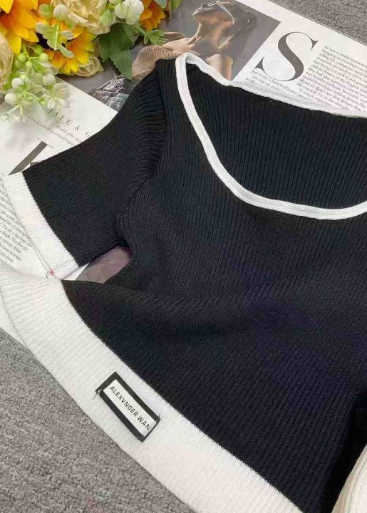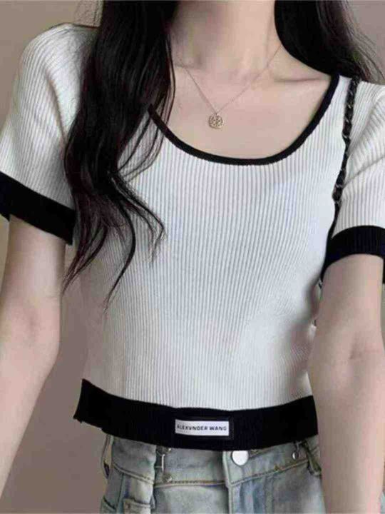夏季新款法式甜辣风撞色港味复古针织短袖T桖,独立包...