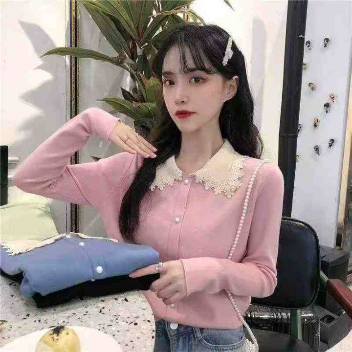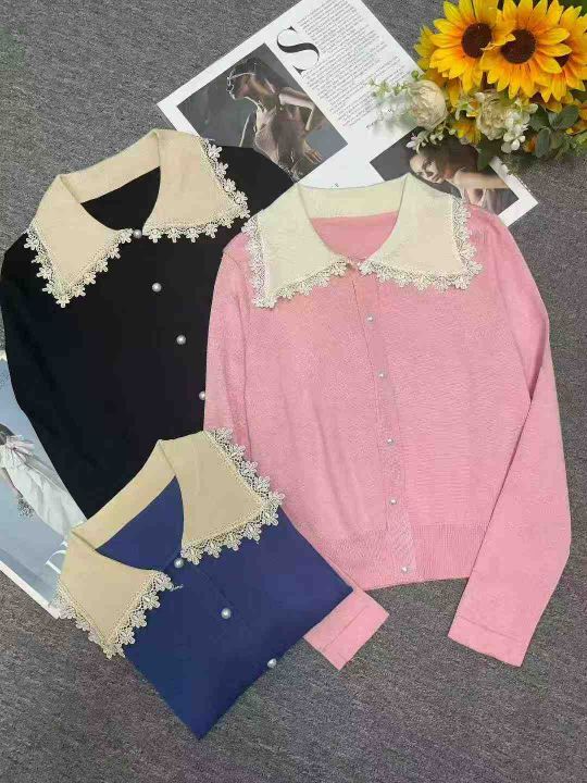 秋冬新款娃娃领甜美洋气蕾丝拼接小香风套头毛衣,独立...