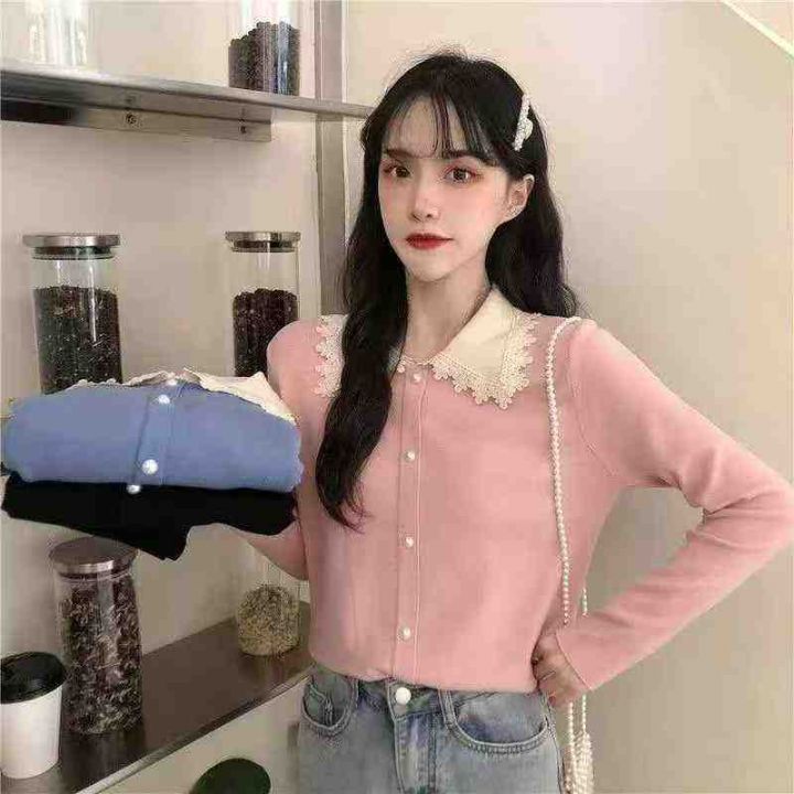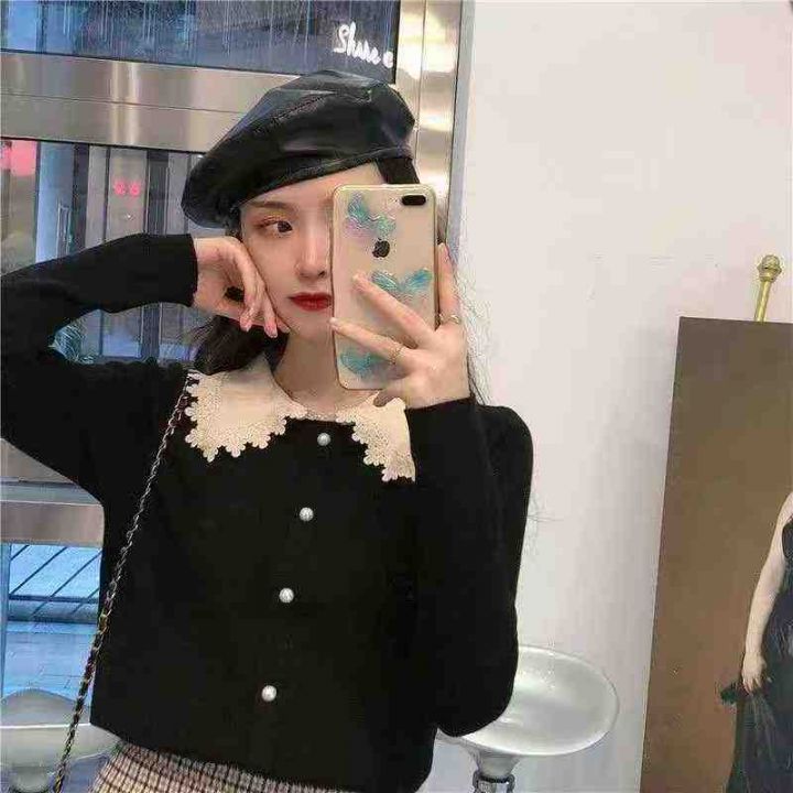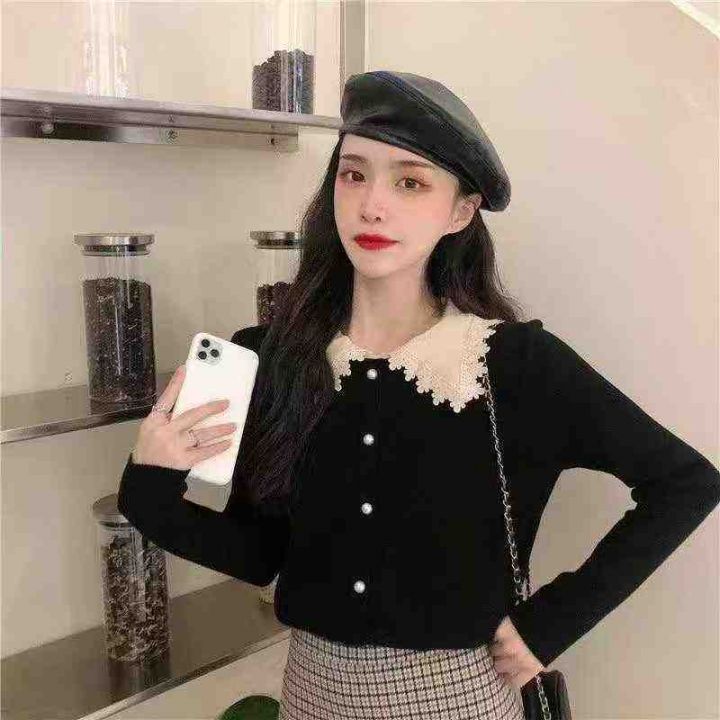 秋冬新款娃娃领甜美洋气蕾丝拼接小香风套头毛衣,独立...