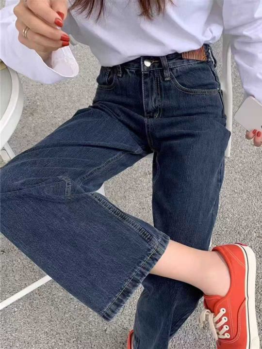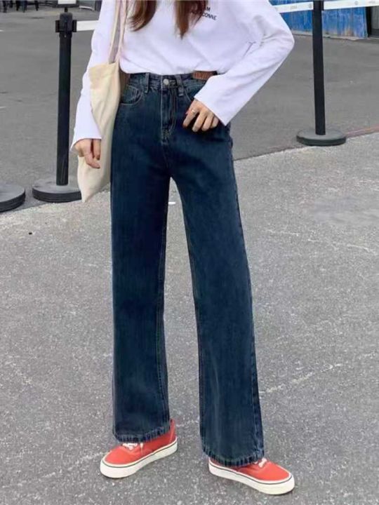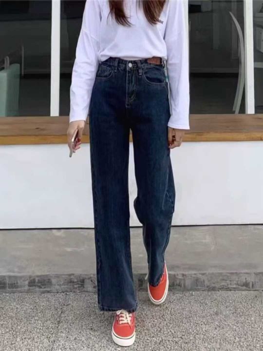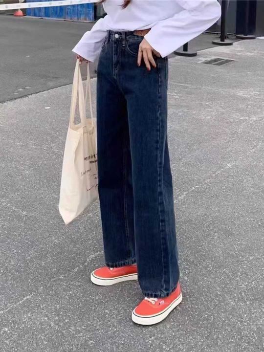 秋季新品大码女装复古高腰直筒阔腿宽松深色牛仔长裤,...