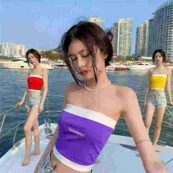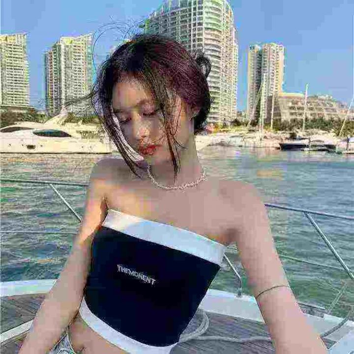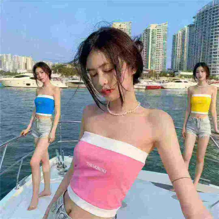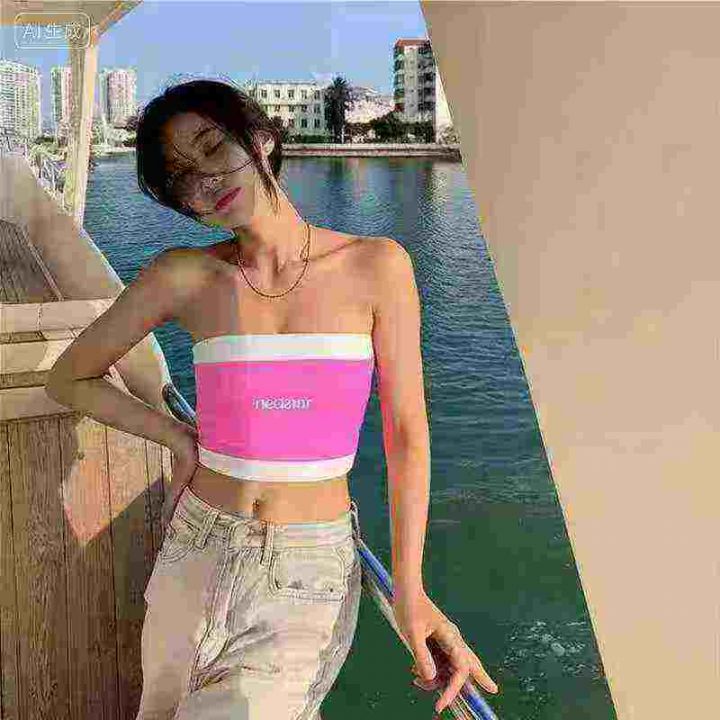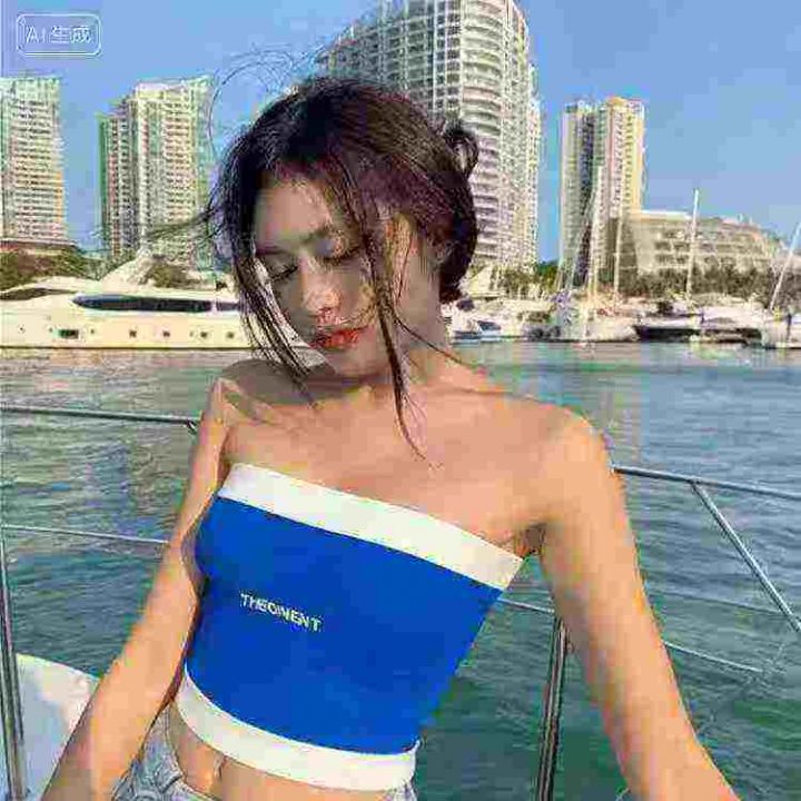 夏秋季新款性感辣妹纯欲风字母刺绣撞色针织抹胸背心,...