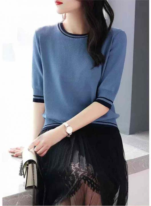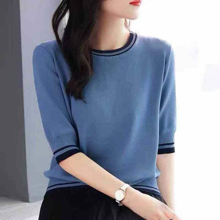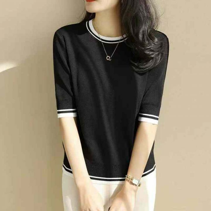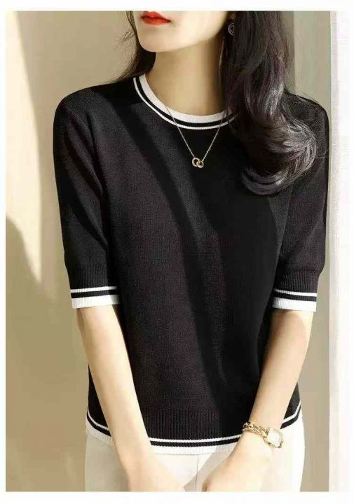 夏季新款日系圆领五分袖拼色冰丝针织T恤衫,独立包装...