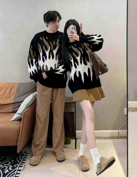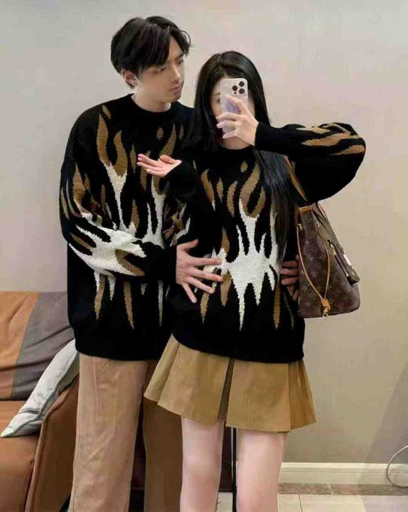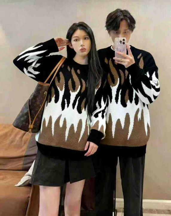 秋冬新款国潮牌原创撞色渐变火焰暗黑亚比风男女同款提花芝麻底圆领套头毛衣,独立包装带吊牌,码数S--L码,面料软糯厚实,宽松款,256件,全清6.9元超低价秒杀!模特上身效果可参考!