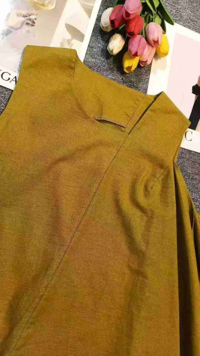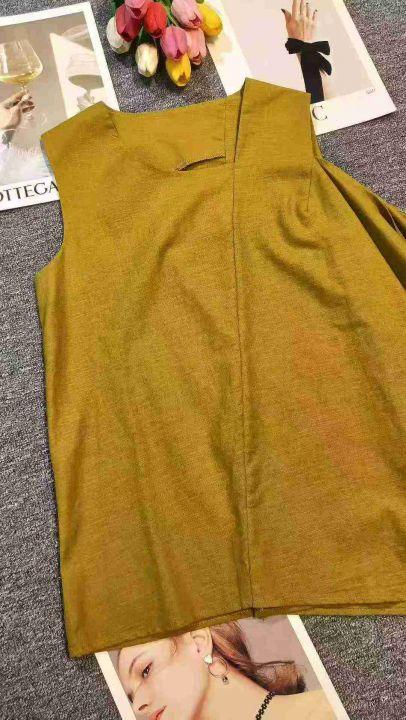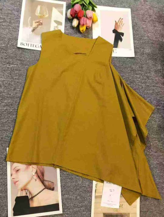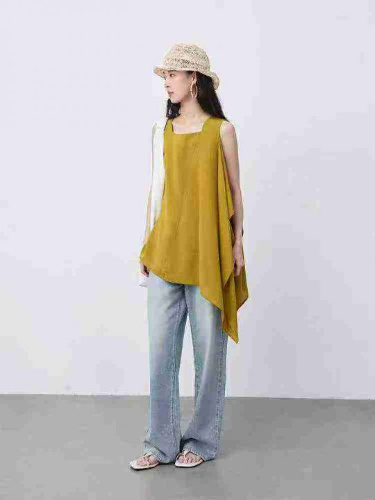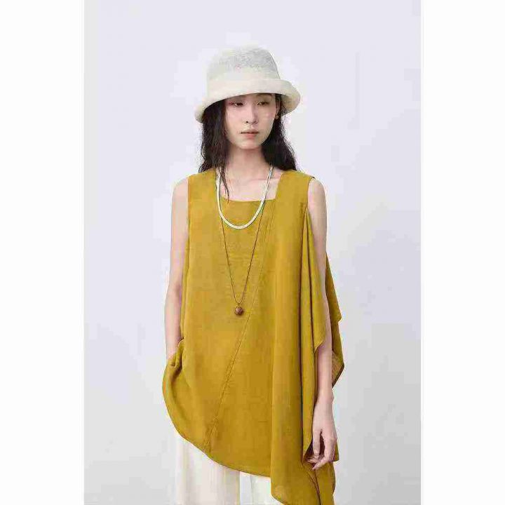 小众姜黄色亚麻不规则荷叶边无袖上衣,[爱心]65件左右,款号#7208码数M-L,穿80-130斤,万佳档口货,原包装️无瑕疵,[666]实体店品质,分货加一