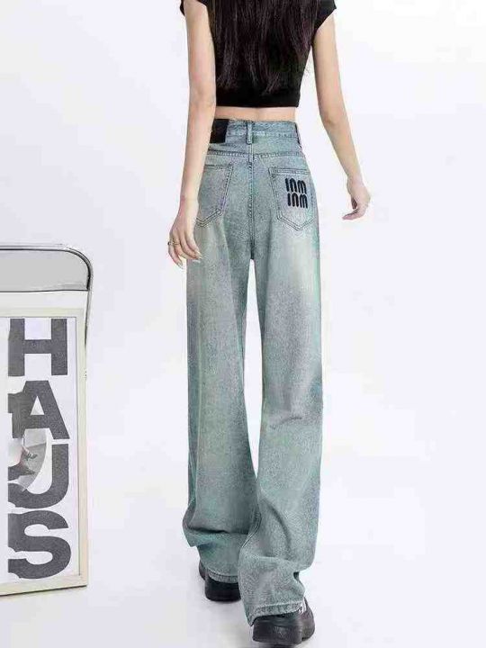 秋季新款高品质高腰显瘦宽松字母刺绣水洗棉直筒阔腿牛...