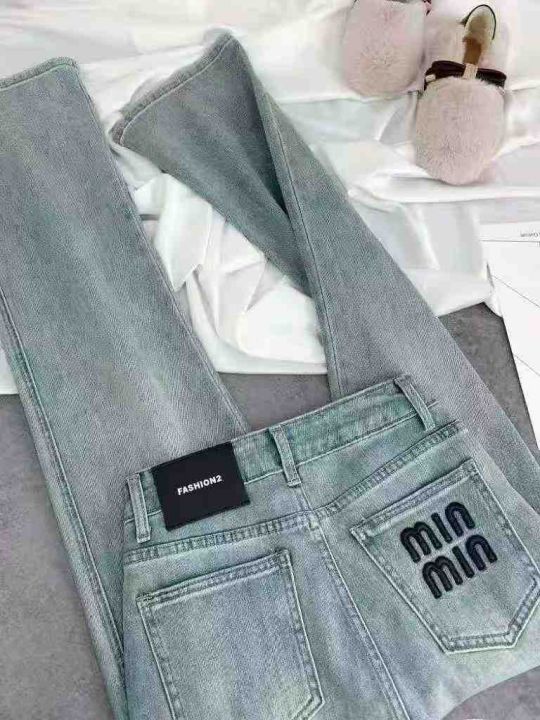秋季新款高品质高腰显瘦宽松字母刺绣水洗棉直筒阔腿牛...