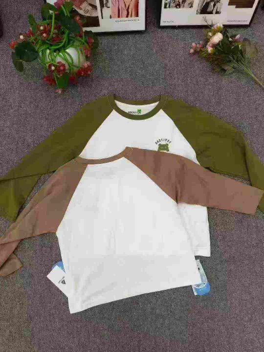 童装春秋装插肩袖撞色上衣洋气长袖,数量2000件左右,尺码110--160,胸前可爱小熊logo,面料柔软亲肤,后领包边,独立包装带吊牌
