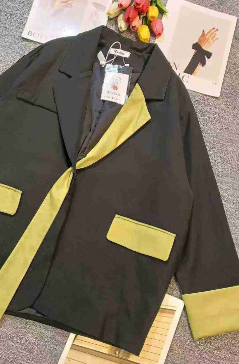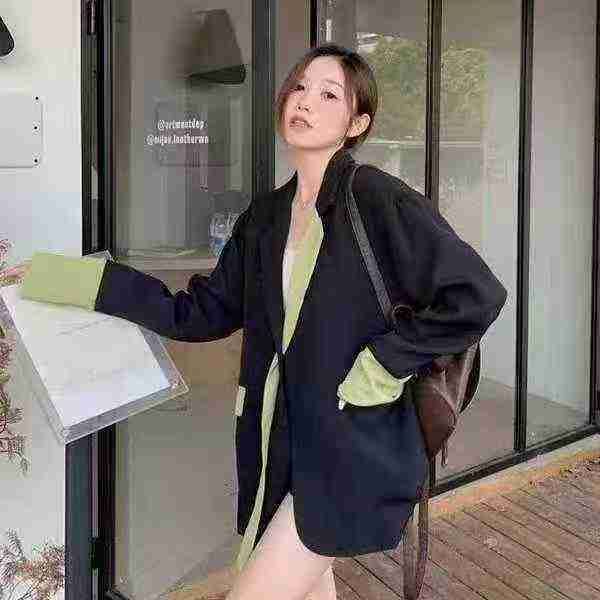 韩系飘带黑色撞色宽松西装外套,[爱心]165件左右,码数S-L,穿80-140斤,万佳档口货,原包装️无瑕疵,[666]实体店品质,分货加一