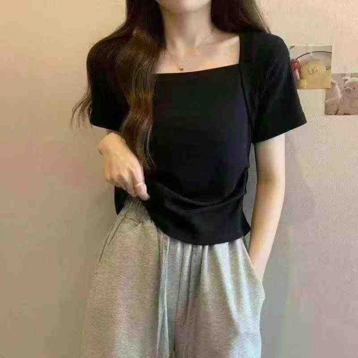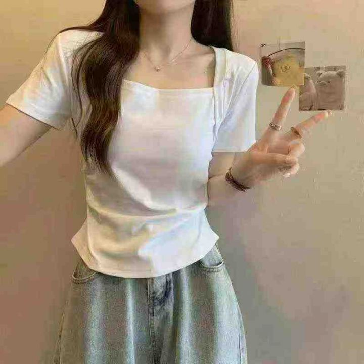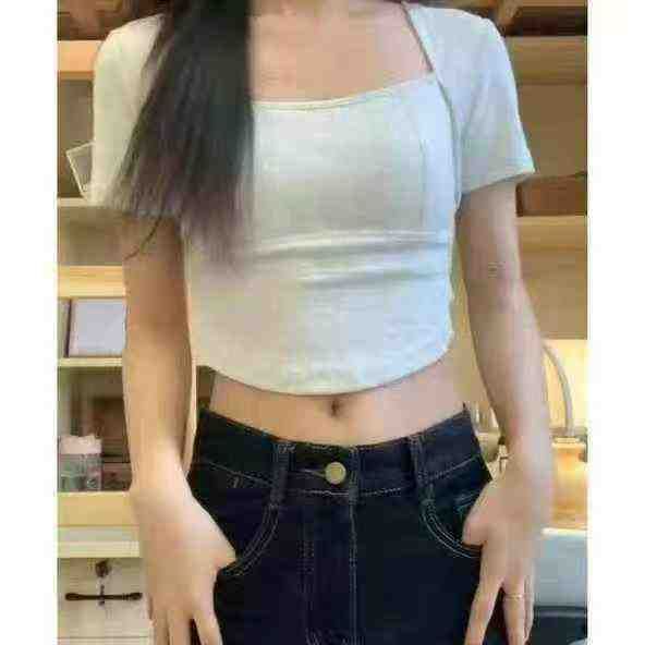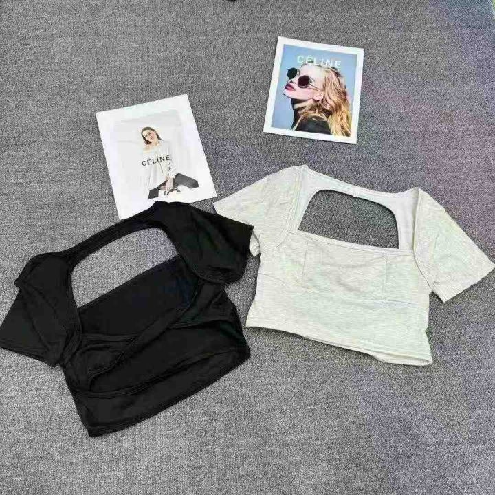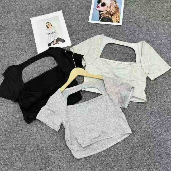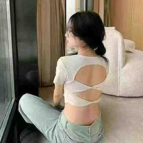全清4.8元,数量800件,纯欲露背短袖T恤方领修身露锁...
