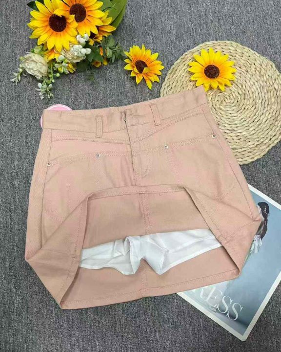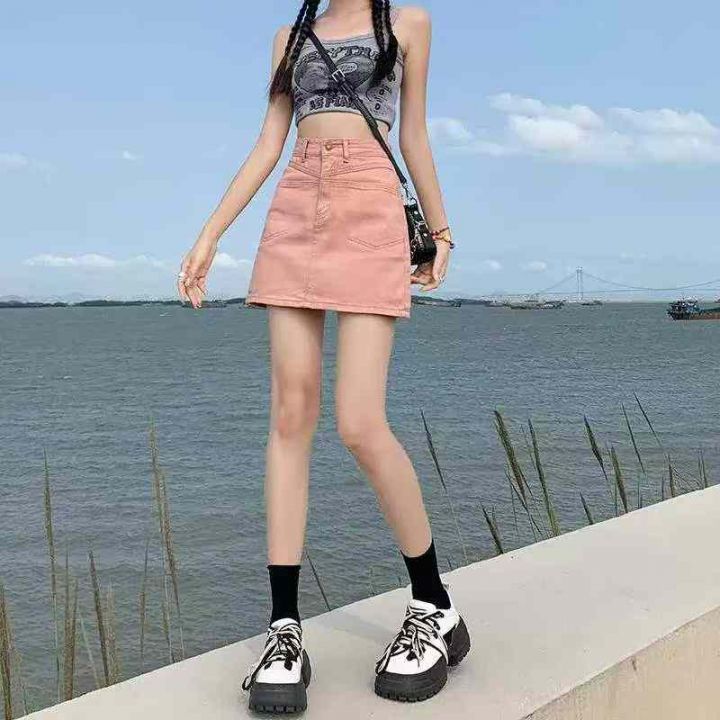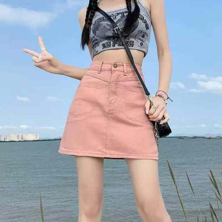 夏季新款脏粉色辣妹显瘦洗水棉牛仔短裙,独立包装带吊...