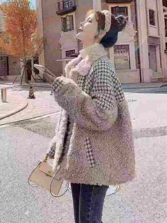 ☕️小香风外套格子拼接羊羔毛外套女冬季短款新款颗粒...