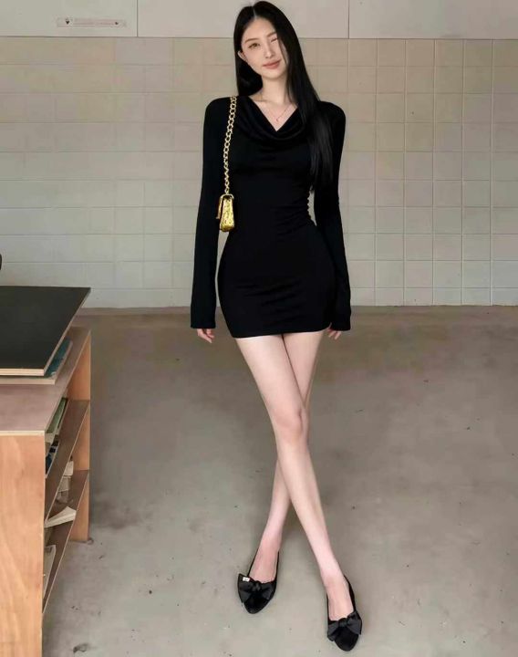 秋冬新款女装百搭性感纯欲风弹力修身显瘦荡领德绒连衣...