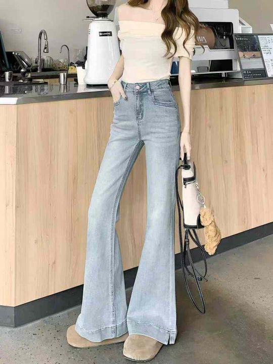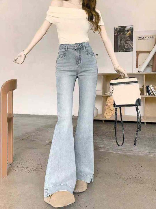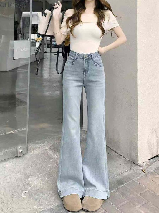 秋季新品弹力洗水棉辣妹风复古水蓝色修身显瘦百搭喇叭...