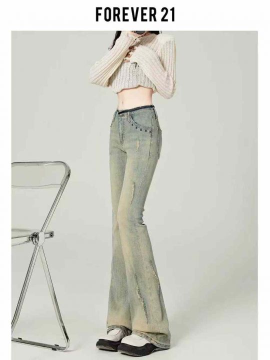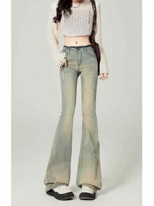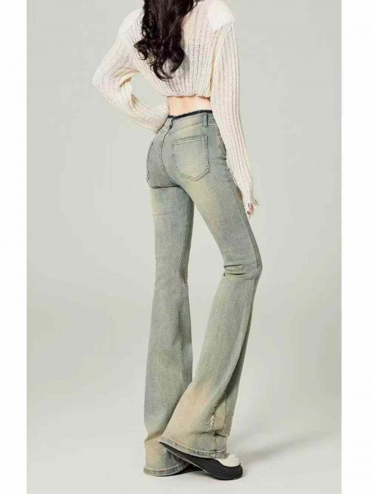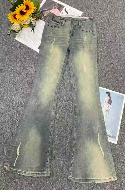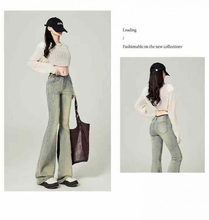 秋季新品弹力美式复古辣妹设计感显瘦微喇叭牛仔裤,独...