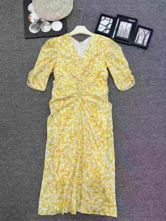 茶歇法式黄色V领碎花连衣裙女夏气质优雅温柔风修身收腰长裙