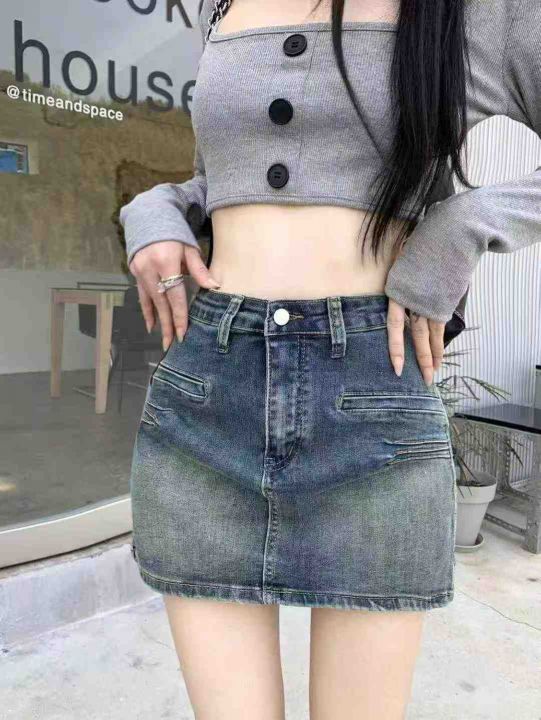 夏季新款高弹力洗水棉复古性感辣妹牛仔半身裙,有内衬...