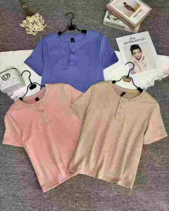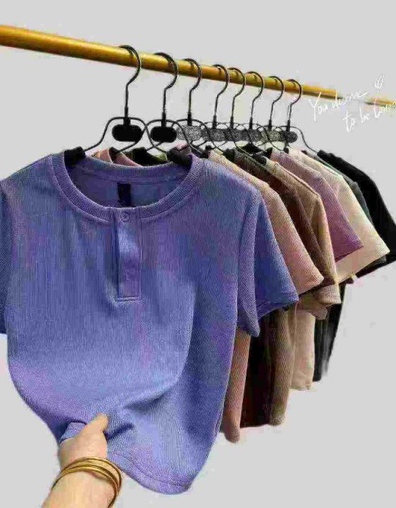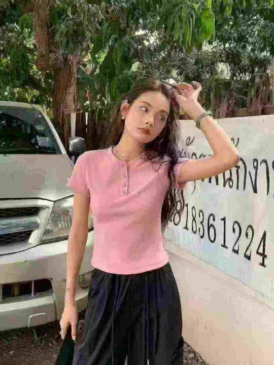 夏别致小圆领纽扣修身短袖t恤,整款多色,高弹力,领...