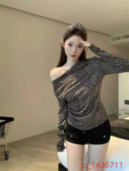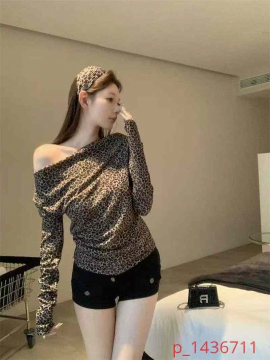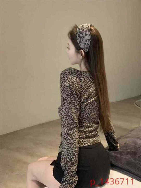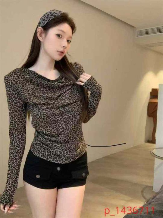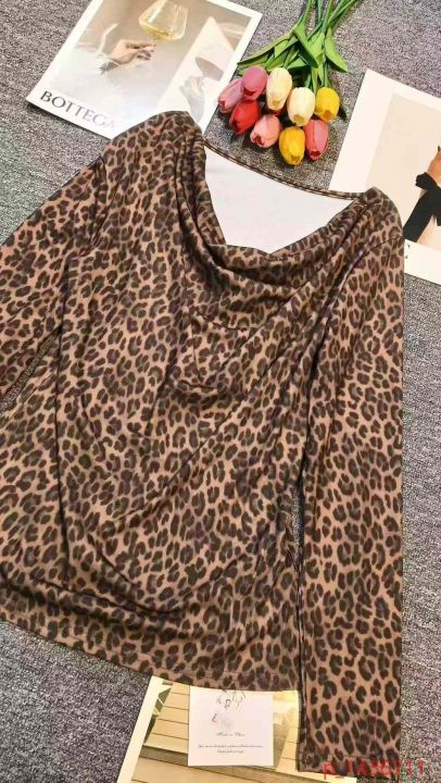 复古豹纹荡领设计感修身长袖上衣,[爱心]70件左右,款号#7163,码数S-2XL,穿80-140斤,万佳档口货,原包装️无瑕疵,[666]实体店品质 _@_@