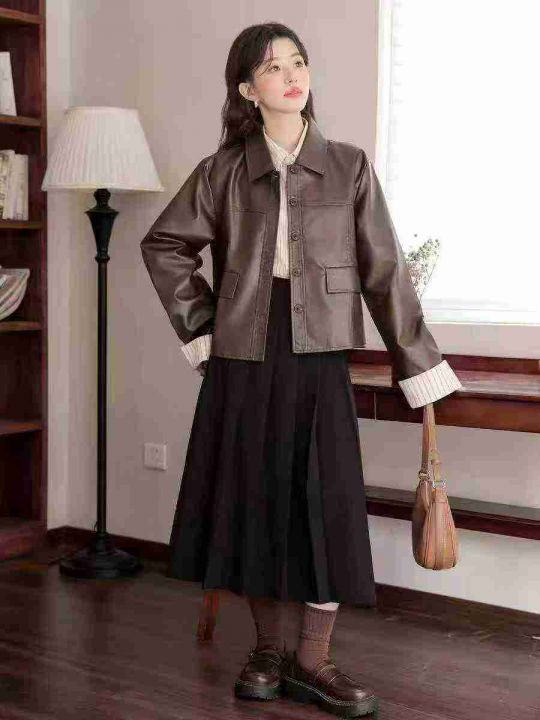 美拉德复古翻领PU皮显瘦百搭夹克皮衣,[爱心]25件左右,码数S-XL,穿80-130斤,万佳档口货,原包装️无瑕疵,[666]实体店品质