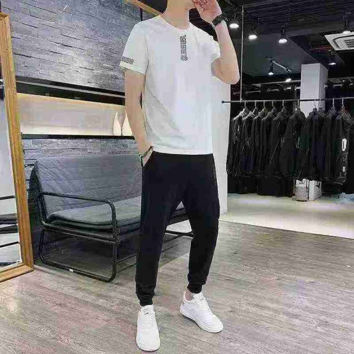 简约通勤百搭宽松休闲短袖配长裤套装,[爱心]40套左右,码数S-5XL,穿80-160斤,工厂原包原吊无瑕疵