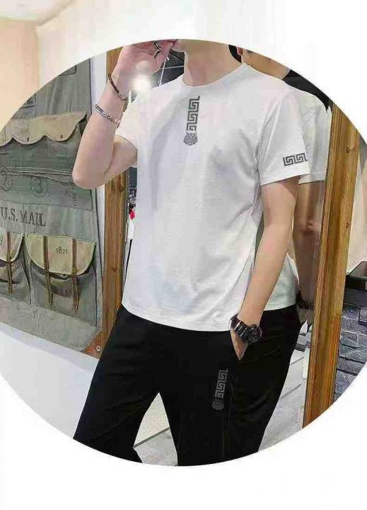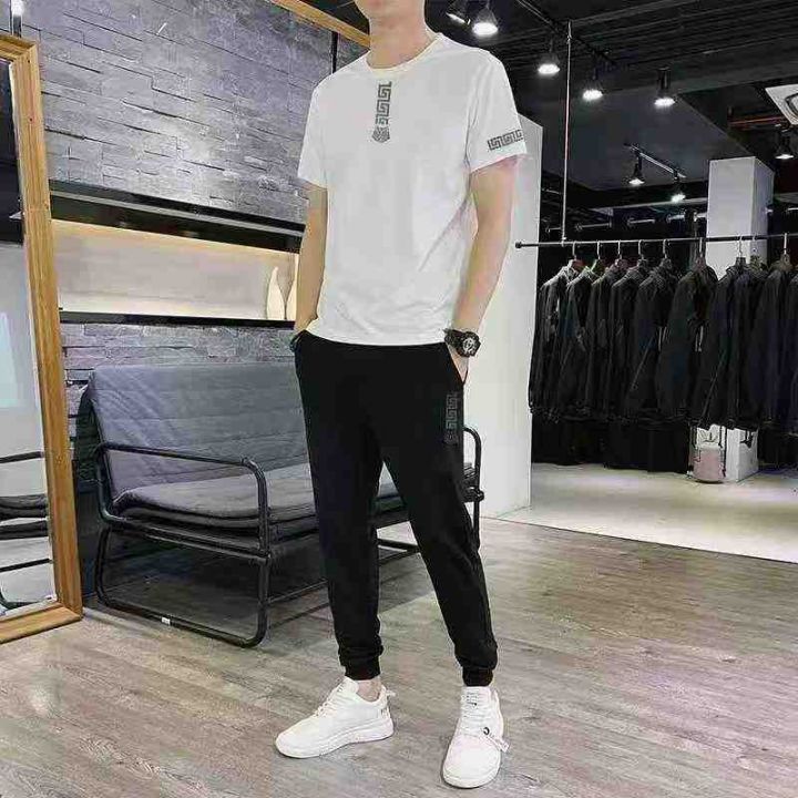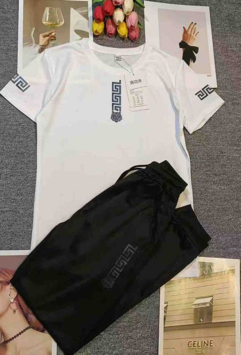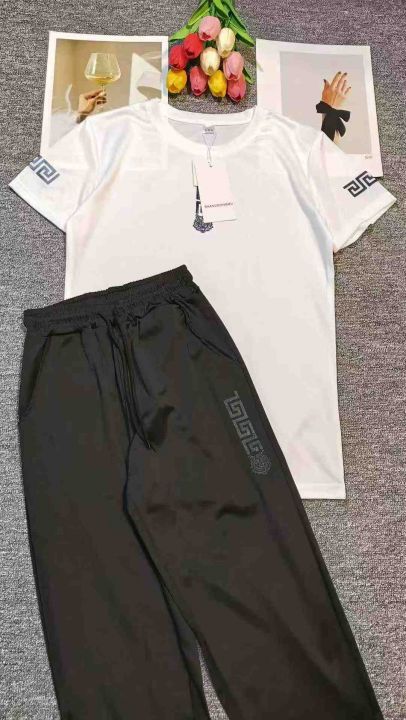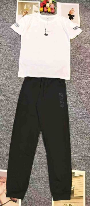 简约通勤百搭宽松休闲短袖配长裤套装,[爱心]40套左右,码数S-5XL,穿80-160斤,工厂原包原吊无瑕疵