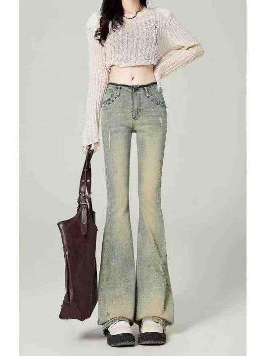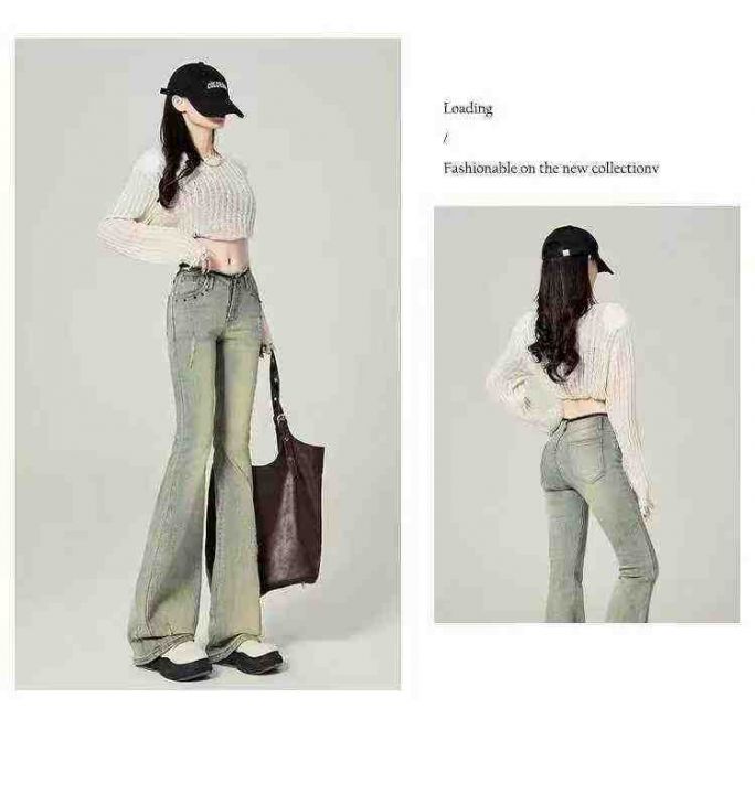 秋季新品弹力美式复古辣妹设计感显瘦微喇叭牛仔裤,独...