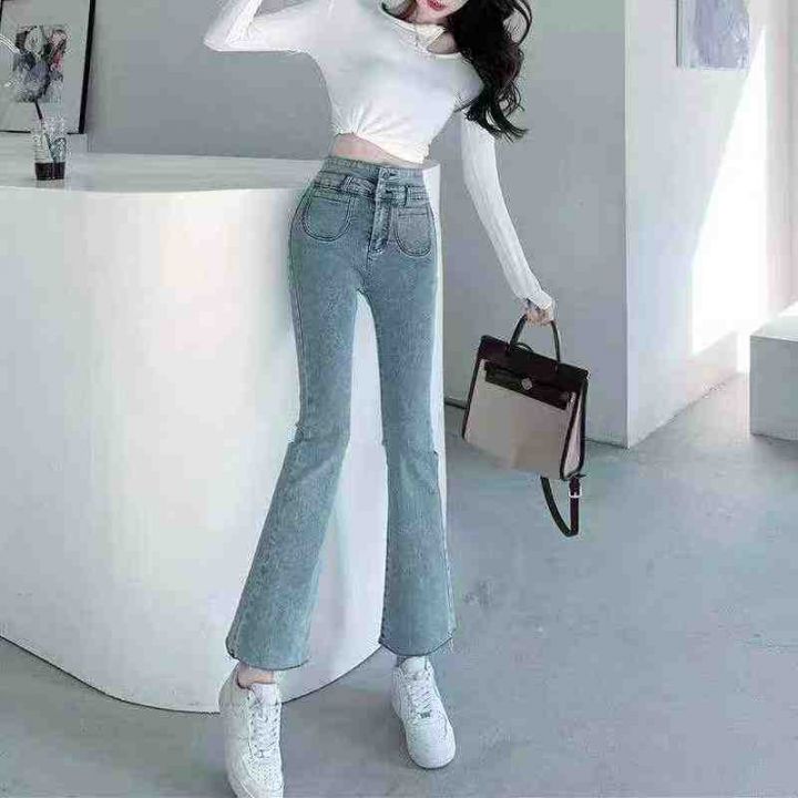 早秋季新品高弹力女装洗水棉毛边微喇叭牛仔裤,独立包...