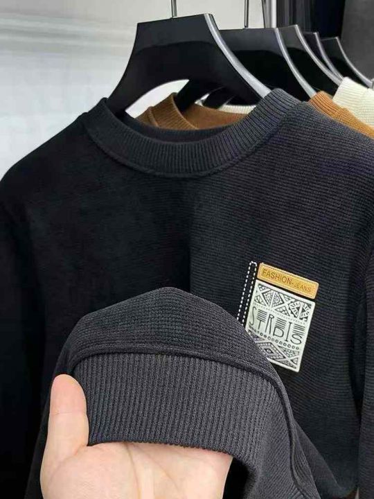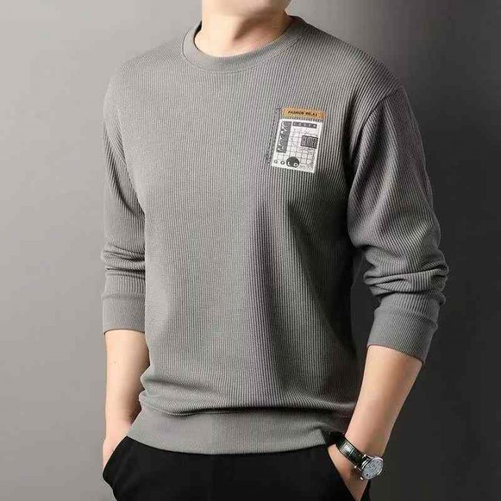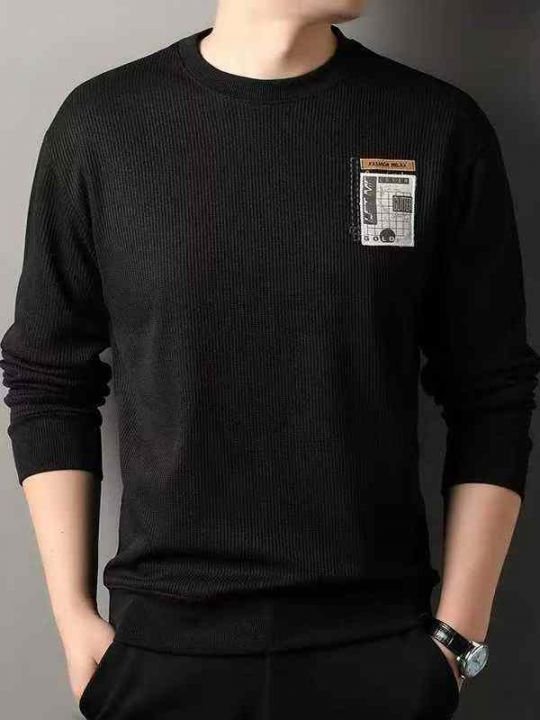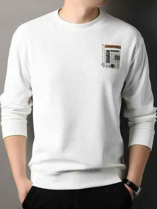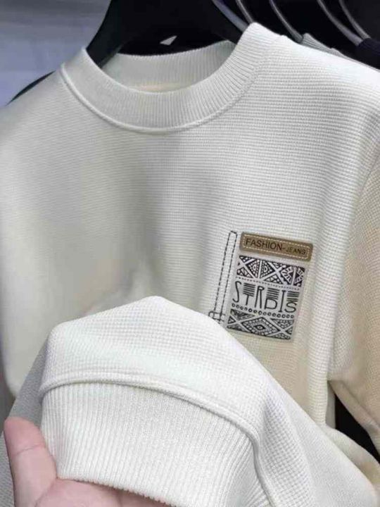 华夫格卫衣男新款秋冬款贴布圆领长袖t恤休闲宽松男士...