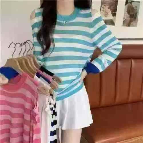 4.9元特价清小心机露肩减龄甜美宽松条纹针织衫,数量500件左右,单款多色,...
