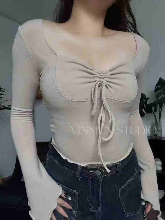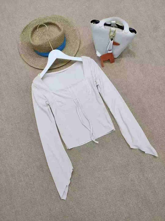 [月亮]:纯欲系带不规则袖口辣妹长袖上衣