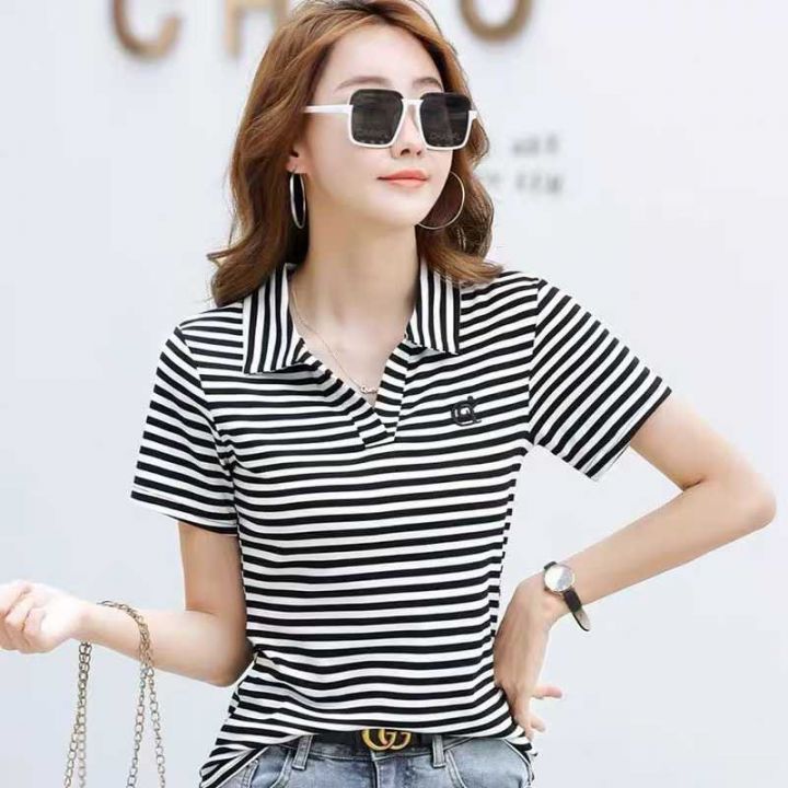 780件短袖T恤女2025夏季新款翻领上衣体恤弹力显瘦百搭条纹,天猫热卖新款,奥代尔罗纹面料带弹力,码数S一3XL,独立卡纸原包装带吊牌,重工刺绣工艺,全清10.8分货加1