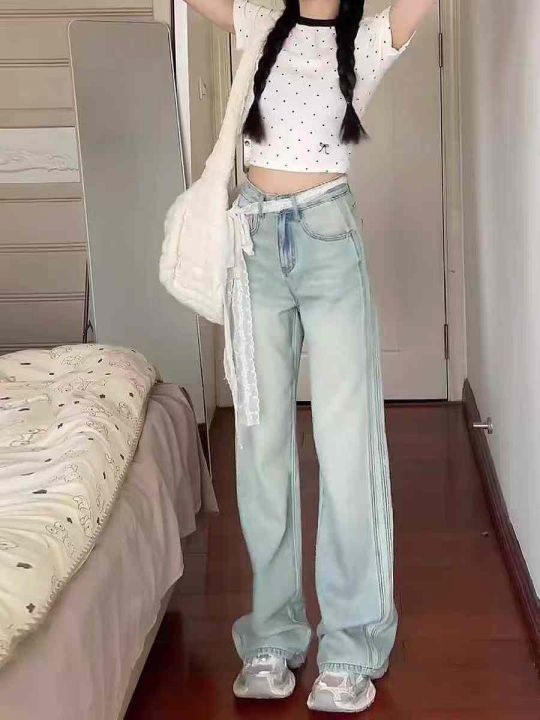 秋季新品洗水棉浅蓝色宽松阔腿高腰显瘦牛仔裤,独立包...