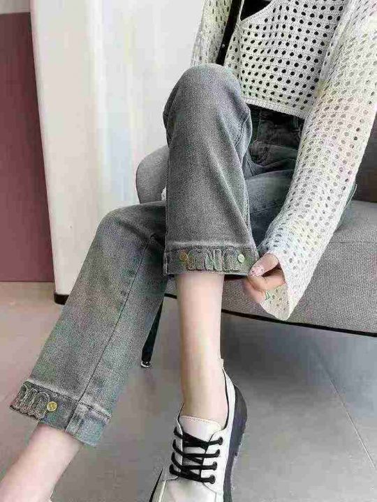 ☕️高弹力烟管牛仔裤女刺绣miu字母图案窄版弹力修身...