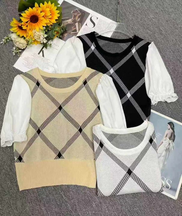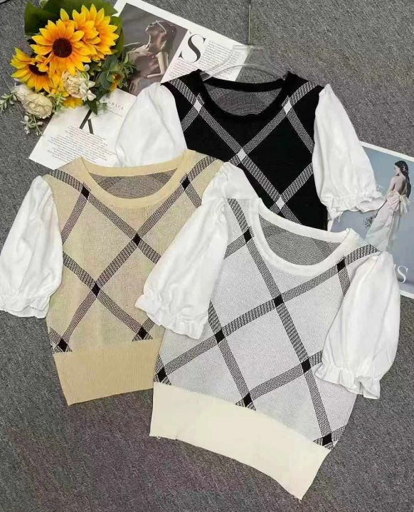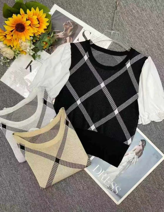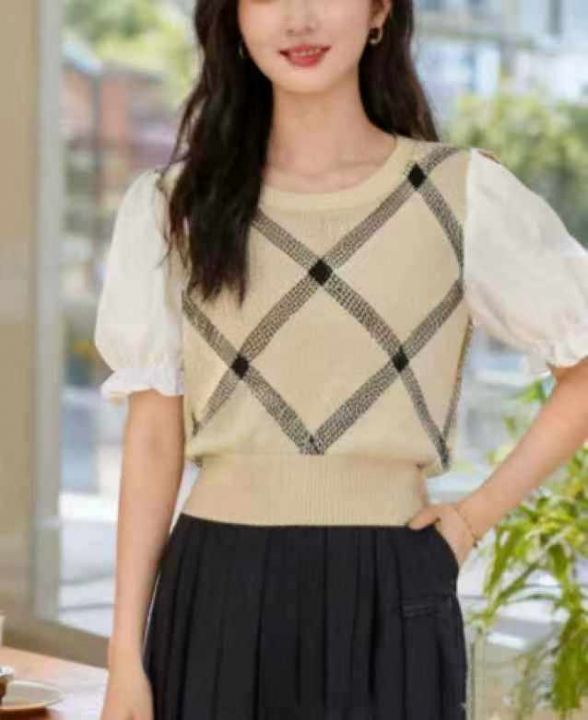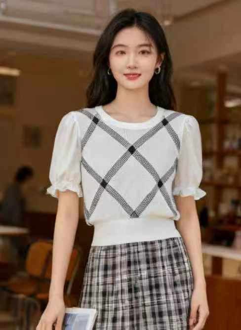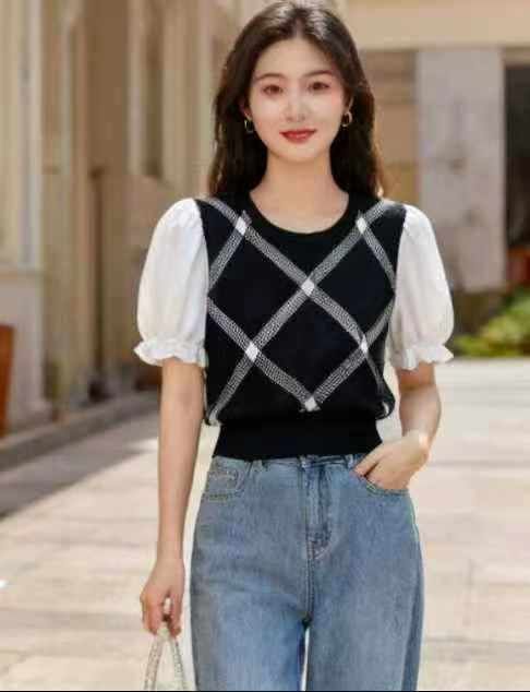 夏季新款雪纺泡泡袖拼接小香风针织短袖T恤,独立包装...