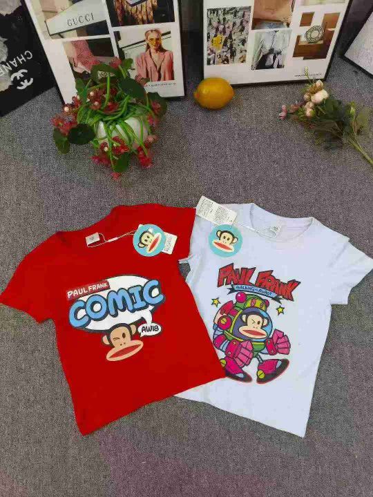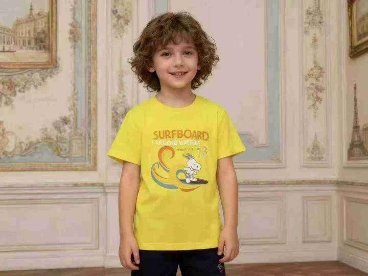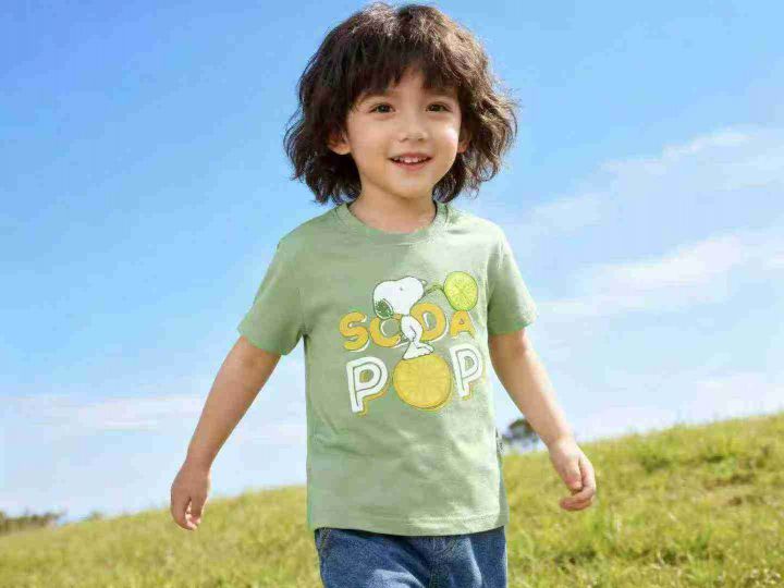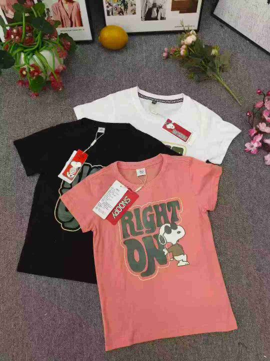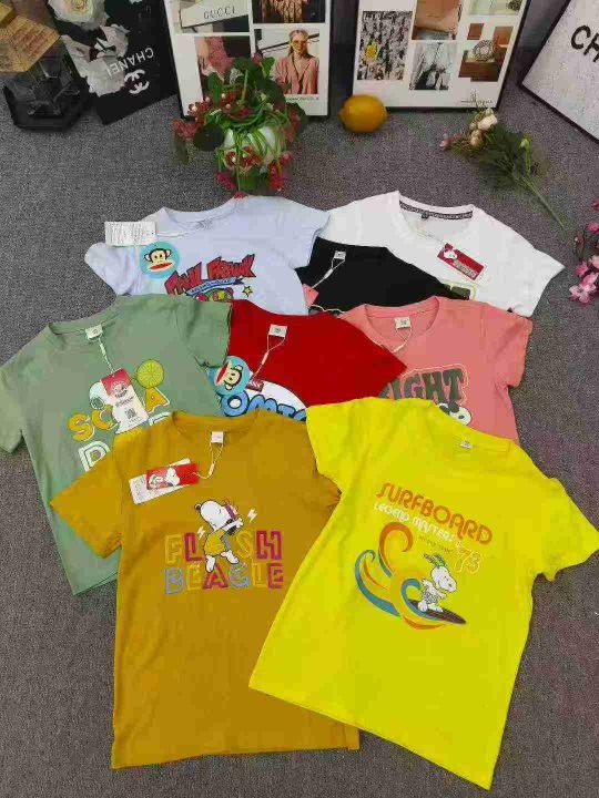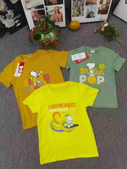 品牌童装中大童短袖T恤 数量500件左右 尺码110--160 两个品牌(史努比、大嘴猴) 有7/8个颜色 后领包边 独立包装带吊牌 货品整洁质佳