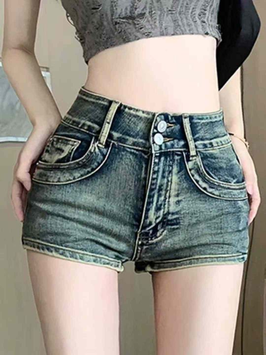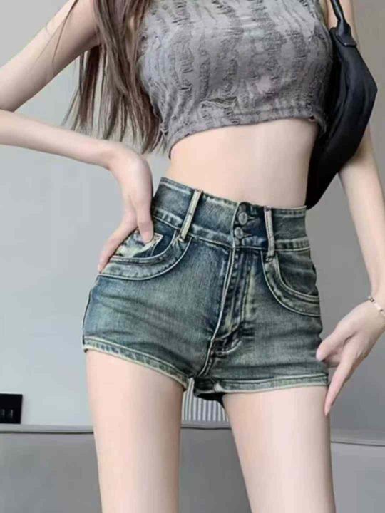 夏季新款高弹力性感辣妹洗水棉复古牛仔短裤,独立包装...