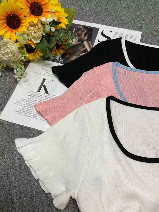 夏季新款高弹力方领木耳边法式奶系温柔风针织短袖T桖,独立包装,均码面料柔软舒适弹力大,370件,全清5.9元超低价秒杀!分货加一!