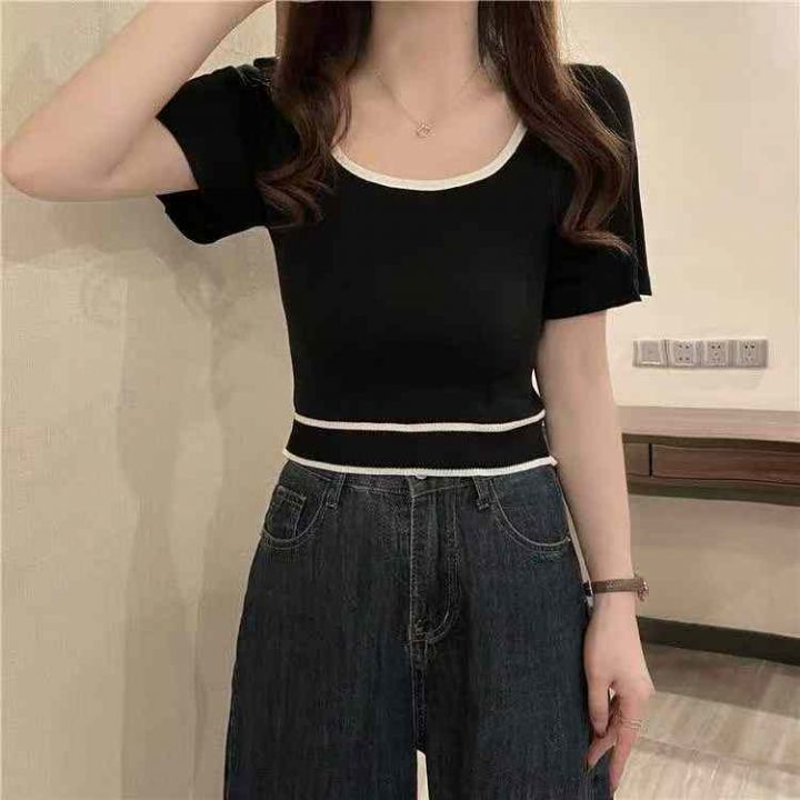 夏季新款高弹力方领木耳边法式奶系温柔风针织短袖T桖...
