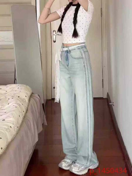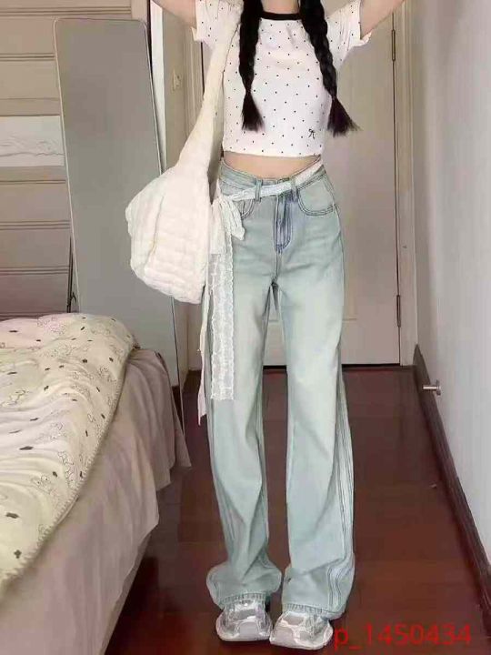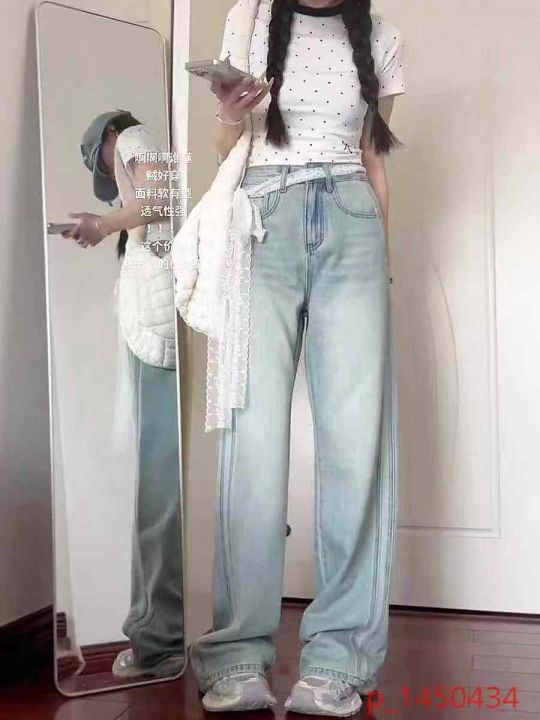 秋季新品洗水棉浅蓝色宽松阔腿高腰显瘦牛仔裤,独立包...