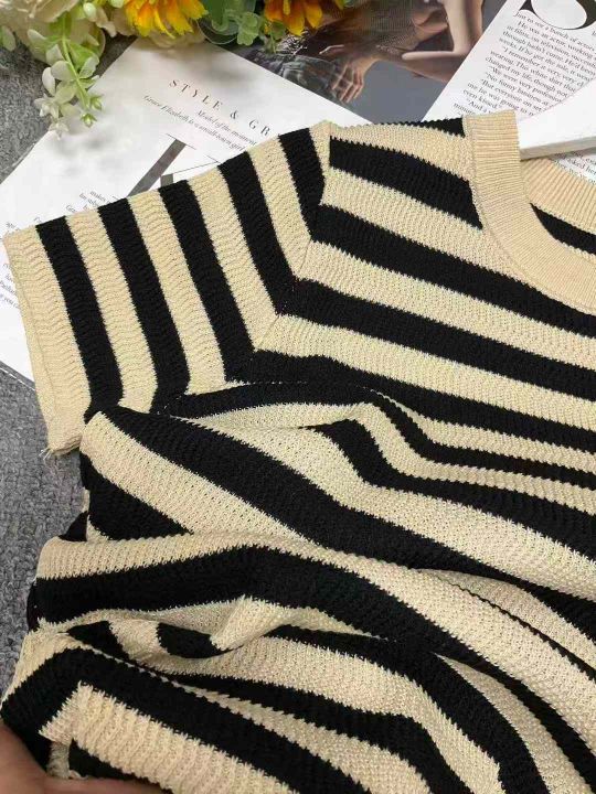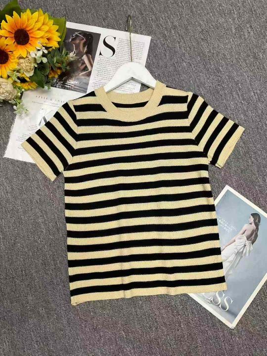 夏季新款撞色条纹针织短袖T桖,独立包装,均码面料柔...